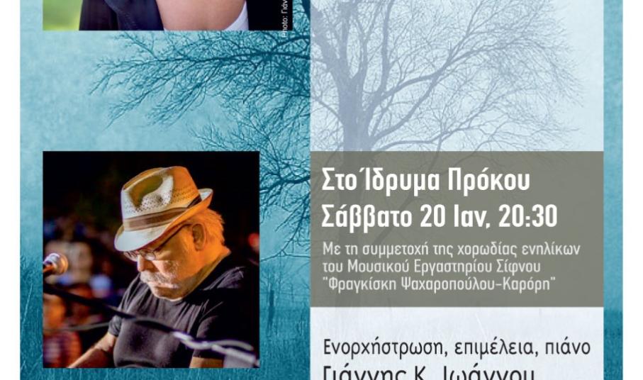 Σας περιμένουμε το Σάββατο 20.1.2018, ώρα 20:30, στο Ίδρυμα Πρόκου στην Απολλωνία, σε μια βραδιά μελοποιημένης ποίησης Ελληνίδων Ποιητριών και όχι μόνον...
