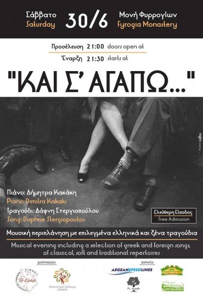 Η Δάφνη Στεργιοπούλου στο τραγούδι και η Δήμητρα Κακάκη στο πιάνο ερμηνεύουν επιλεγμένα ελληνικά και ξένα τραγούδια που μιλούν για την αγάπη, το μυστήριο, την χαρά, τον έρωτα…. Κομμάτια κλασσικού, ελαφρού και ρετρό ρεπερτορίου, συνδυασμένα με δημιουργήματα τοπικών προφορικών παραδόσεων, σκέψεις και στίχους. «Και σ’ αγαπώ», μία πρόταση για μουσική περιπλάνηση, το Σάββατο 30 Ιουνίου στην Μονή Φυρρογίων, στη Σίφνο. Ερωτικό, Χρυσαλιφούρφουρο, Setum’ ami, Απόψε τα μεσάνυχτα, Ποιος είν’ τρελός από έρωτα, Περνοδιαβαίνω για να δω, Χάρτινο το φεγγαράκι, Lahistoriadeunamor, Ζητάτε να σας πω, Lavieenrose, Χαράματα η ώρα τρεις… κι άλλες πολλές, αγαπημένες μελωδίες!