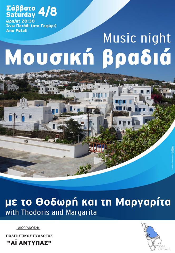 To Σάββατο 4 Αυγούστου, 20:30, στο Άνω Πετάλι (στο Γεφύρι) μουσική βραδιά με τη Μαργαρίτα και το Θοδωρή. Διοργάνωση: Πολιτιστικός Σύλλογος «Άη Αντύπφας». Με την υποστήριξη του Δήμου Σίφνου και του Π.Σ.Σ.