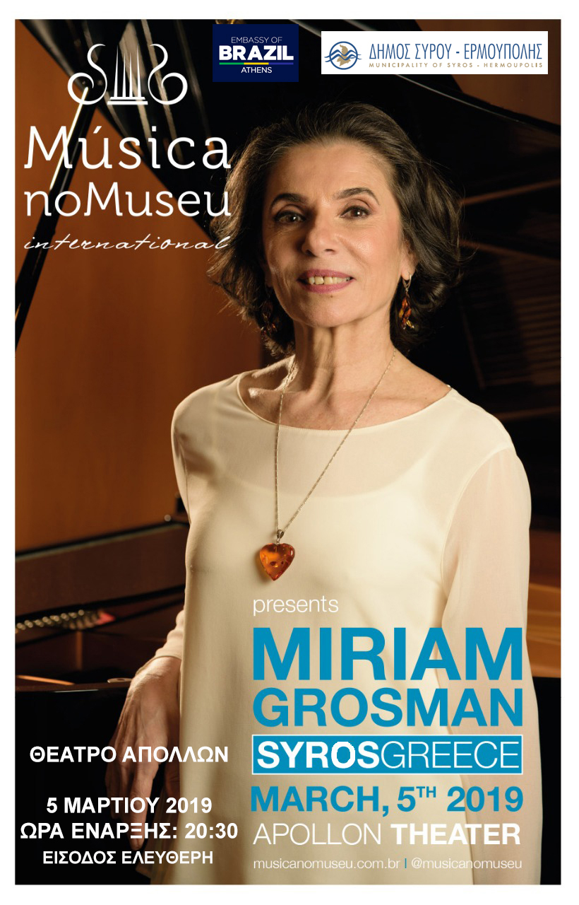 Στο πλαίσιο του Συριανού Καρναβαλιού «Γεώργιος Σουρής» 2019, ο  Δήμος Σύρου- Ερμούπολης, σε συνδιοργάνωση με την Πρεσβείας της Βραζιλίας, παρουσιάζουν ένα ρεσιτάλ πιάνου MIRIAM GROSMAN στο Θέατρο Απόλλων, την Τρίτη 5 Μαρτίου 2019 και ώρα 20:30.
