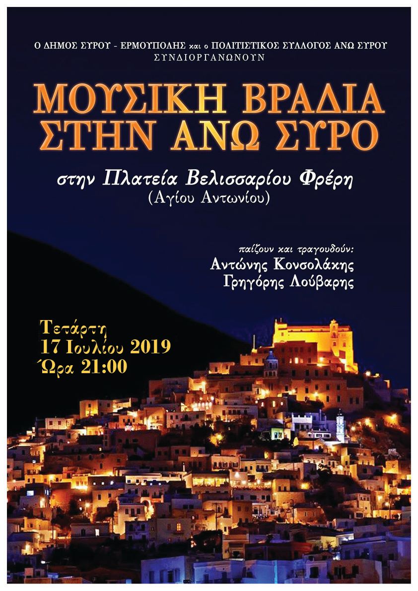 Διοργανωτές της μουσικής βραδιάς είναι ο Δήμος Σύρου – Ερμούπολης και ο Πολιτιστικός Σύλλογος Άνω Σύρου.