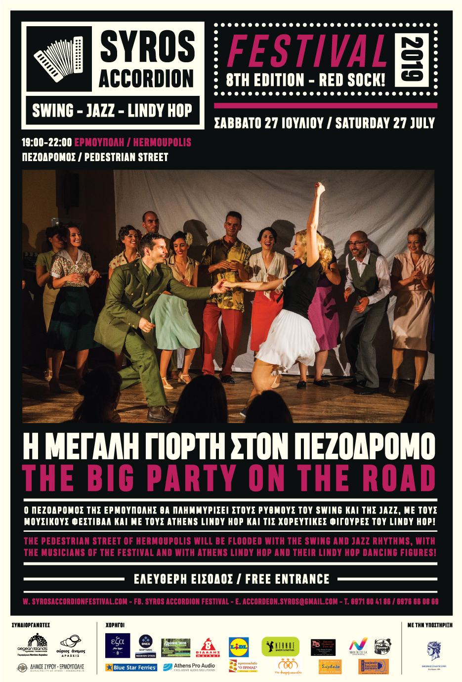 Το Σάββατο 27/7, το Φεστιβάλ γιορτάζει και ολοκληρώνεται με μουσικές, μουσικούς, χορούς και χορευτές στον πεζόδρομο της Ερμούπολης και με μοναδικές χορευτικές στιγμές swing party, σε αγαπημένες μουσικές από τα ‘20s μέχρι και τα ‘50s και εντυπωσιακές φιγούρες με τους Athens Lindy Hop.