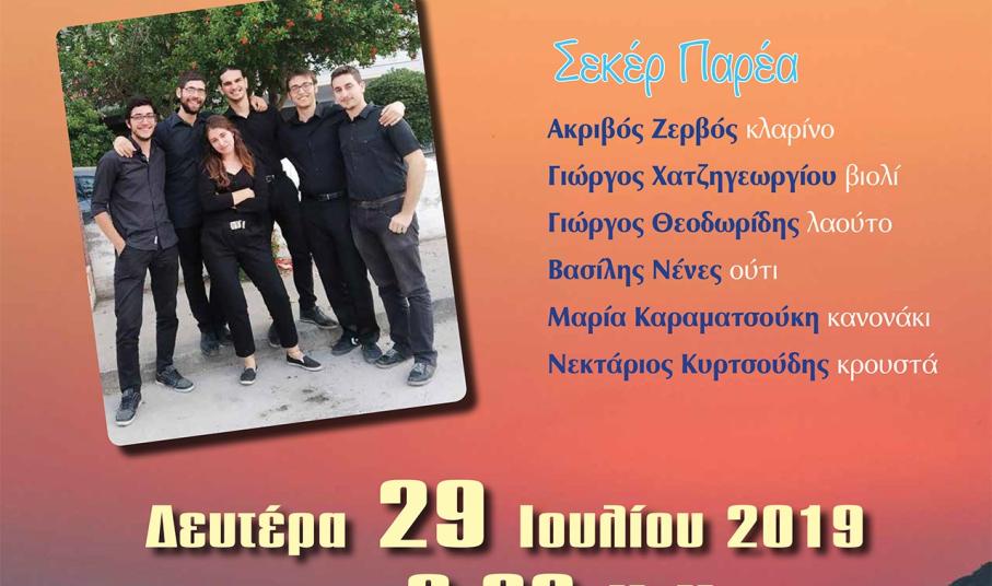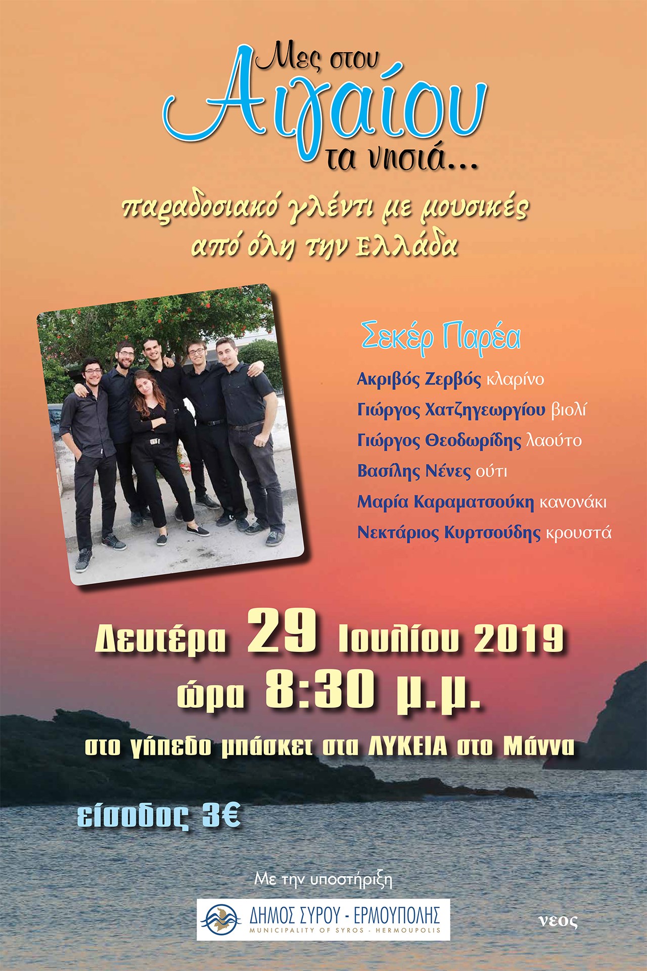 Αυτό το καλοκαίρι, το συγκρότημα αποφάσισε να συνδυάσει δουλειά και διακοπές. Έτσι, τα δύο Συριανά μέλη του προσκάλεσαν στην πρωτεύουσα των Κυκλάδων τους υπόλοιπους τέσσερις της παρέας για μερικές στιγμές χαλάρωσης, αλλά και για να παρουσιάσουν τη δουλειά τους στο κοινό του νησιού. Στο πλαίσιο αυτό, το σχήμα ετοιμάζεται να μας ταξιδέψει «Μες του Αιγαίου τα νησιά…» μέσα από ένα παραδοσιακό γλέντι με μουσικές από όλη την Ελλάδα, το οποίο θα πραγματοποιηθεί τη Δευτέρα 29 Ιουλίου 2019 και ώρα 20:30, στο γήπεδο μπάσκετ στο Λυκειακό συγκρότημα του Μάννα.