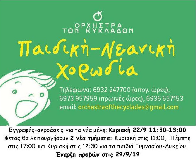 Η Ορχήστρα των Κυκλάδων ενημερώνει ότι την Κυριακή 22/9 και ώρα 11:30 έως 13:00, θα γίνουν οι εγγραφές-ακροάσεις για τα νέα μέλη που επιθυμούν να ενταχθούν στην Παιδική - Νεανική Χορωδία και που θα πρέπει να έχουν ηλικία 8 ετών και άνω.