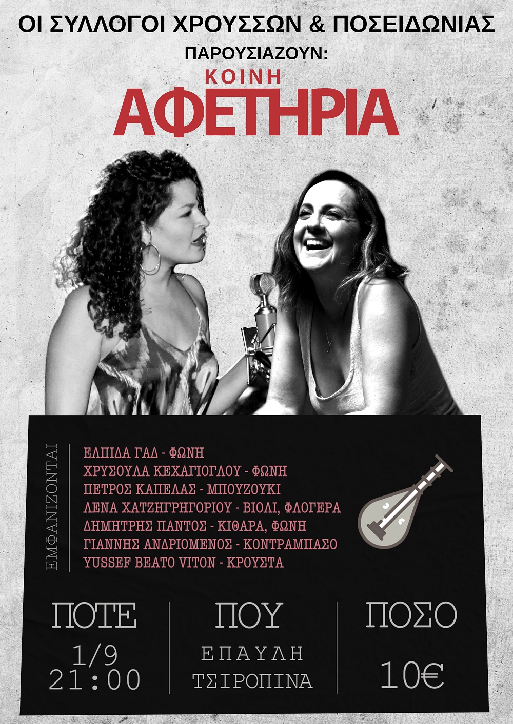 Οι Πολιτιστικοί Σύλλογοι Ποσειδωνίας “ο Ποσειδών” και Χρούσσων, συνδιοργανώνουν μια μοναδική μουσική βραδιά με τίτλο “Κοινή Αφετηρία" την Τρίτη 1.9.2020 στις 21.00 στην έπαυλη Τσιροπινά στην Ποσειδωνία.