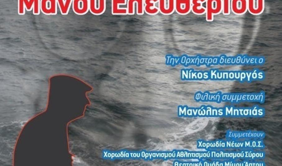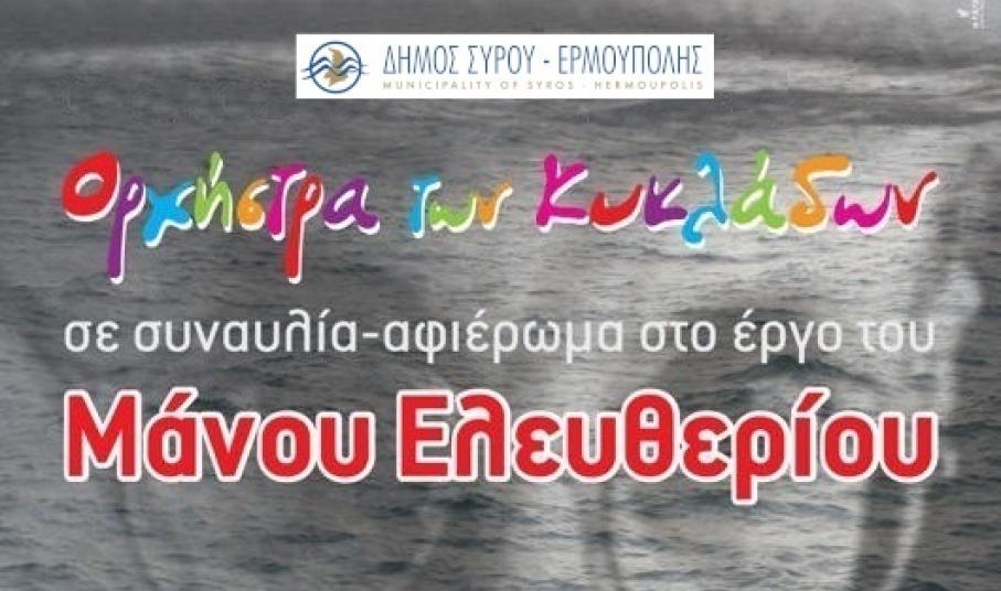 Η Ορχήστρα των Κυκλάδων, σε συνεργασία με το Γραφείο Πολιτισμού του Δήμου Σύρου - Ερμούπολης και με αφορμή τα 10 χρόνια από τη διεξαγωγή της συναυλίας – αφιέρωμα στο έργο του Μάνου Ελευθερίου, που πραγματοποιήθηκε στο Θέατρο Απόλλων της Σύρου στις 14 & 15/5/2011, μεταδίδει διαδικτυακά τη συναυλία με ελεύθερη πρόσβαση για το κοινό.