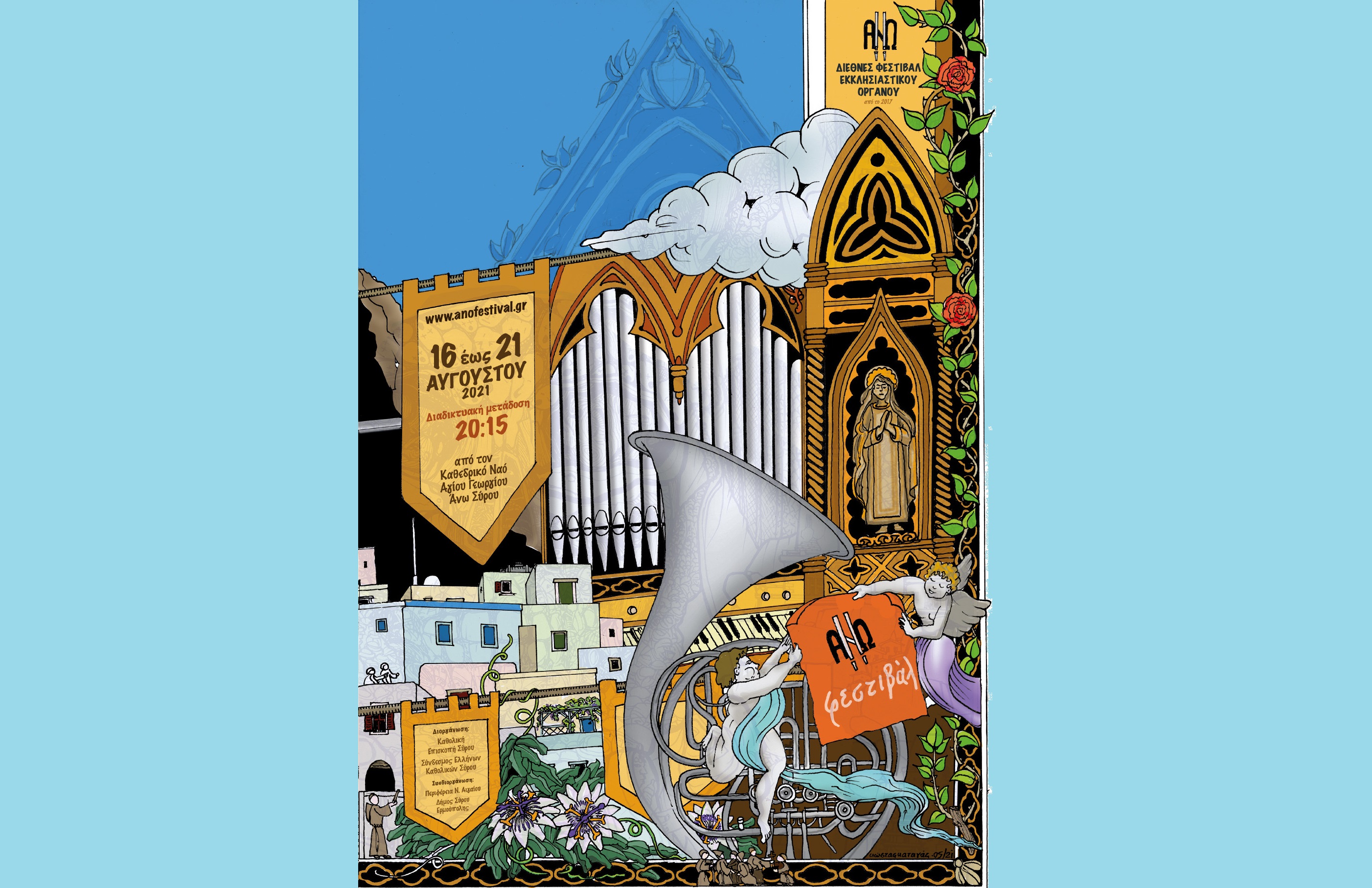 Η Καθολική Επισκοπή Σύρου και ο Σύνδεσμος Ελλήνων Καθολικών Σύρου, με συνδιοργανωτές την Περιφέρεια Νοτίου Αιγαίου και τον Δήμο Σύρου Ερμούπολης, παρουσιάζουν το προωθητικό βίντεο του 5ου Διεθνούς Φεστιβάλ Εκκλησιαστικού Οργάνου «ΑΝΩ», το οποίο είναι βασισμένο στο σχέδιο της αφίσας που φιλοτέχνησε ο εικαστικός Κωνσταντίνος Καταγάς.