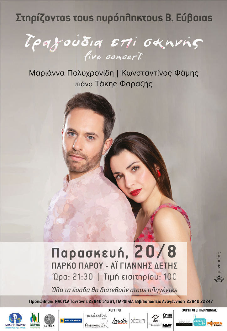 Η εταιρεία πολιτιστικών εκδηλώσεων «Μενοικέας», με πρωτοβουλία του Κωνσταντίνου Φάμη, στηρίζει τους πυρόπληκτους της Βόρειας Εύβοιας, με την πραγματοποίηση της μουσικής παράστασης «Τραγούδια επί σκηνής». Αρωγός της πρωτοβουλίας , ο Δήμος Πάρου.