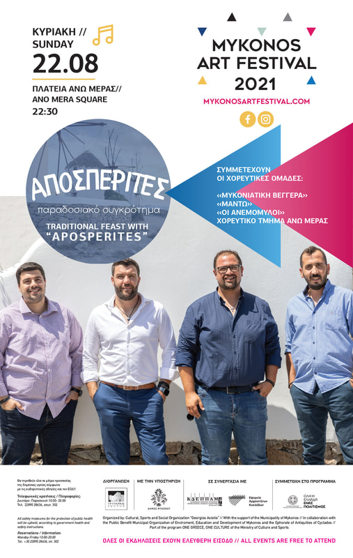 Στο πλαίσιο του «Mykonos Art Festival», το συγκρότημα «Αποσπερίτες» παρουσιάζει την Κυριακή 22 Αυγούστου στην πλατεία Άνω Μεράς ένα πρόγραμμα με έντονο το τοπικό παραδοσιακό στοιχείο, καθώς και ευρύ λαϊκό ρεπερτόριο. Το συγκρότημα δημιουργήθηκε από τους Μυκονιάτες μουσικούς Βασίλη Γρυπάρη (βιολί, τραγούδι) και Μάριο Ζουγανέλη (λαούτο, τραγούδι). Συμμετέχουν ο Νίκος Κοντιζάς (τσαμπούνα) και ο Μάριος Ξυδάκης (τύμπανα). Το σχήμα αγκαλιάστηκε άμεσα από την τοπική κοινωνία και συμμετέχει σε πάρα πολλές τοπικές εκδηλώσεις και πανηγύρια.