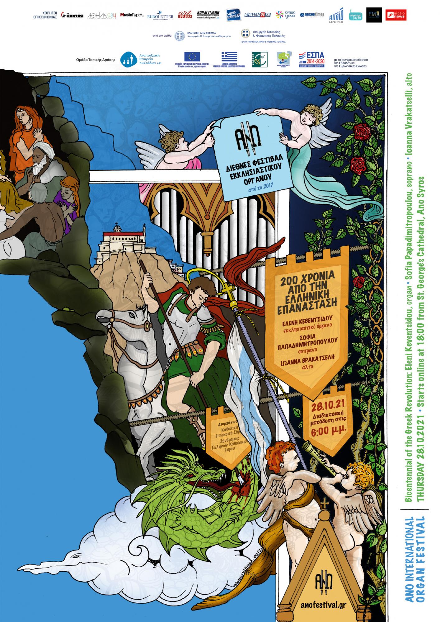 Το Διεθνές Φεστιβάλ Εκκλησιαστικού Οργάνου «ΑΝΩ» συμμετέχει στις εκδηλώσεις για τα 200 χρόνια από την Ελληνική Επανάσταση που πραγματοποιούνται καθόλη τη διάρκεια του 2021, αναδεικνύοντας διαχρονικές εθνικές αξίες και, παράλληλα, αποδίδοντας φόρο τιμής στους προγόνους μας. Το Φεστιβάλ «ΑΝΩ» παρουσιάζει μια εορταστική συναυλία με ελληνικού ενδιαφέροντος πρόγραμμα, με έργα για εκκλησιαστικό όργανο και δύο γυναικείες φωνές. Συμμετέχουν: Σοφία Παπαδημητροπούλου, σοπράνο, Ιωάννα Βρακατσέλη, άλτο και Ελένη Κεβεντσίδου, εκκλησιαστικό όργανο.