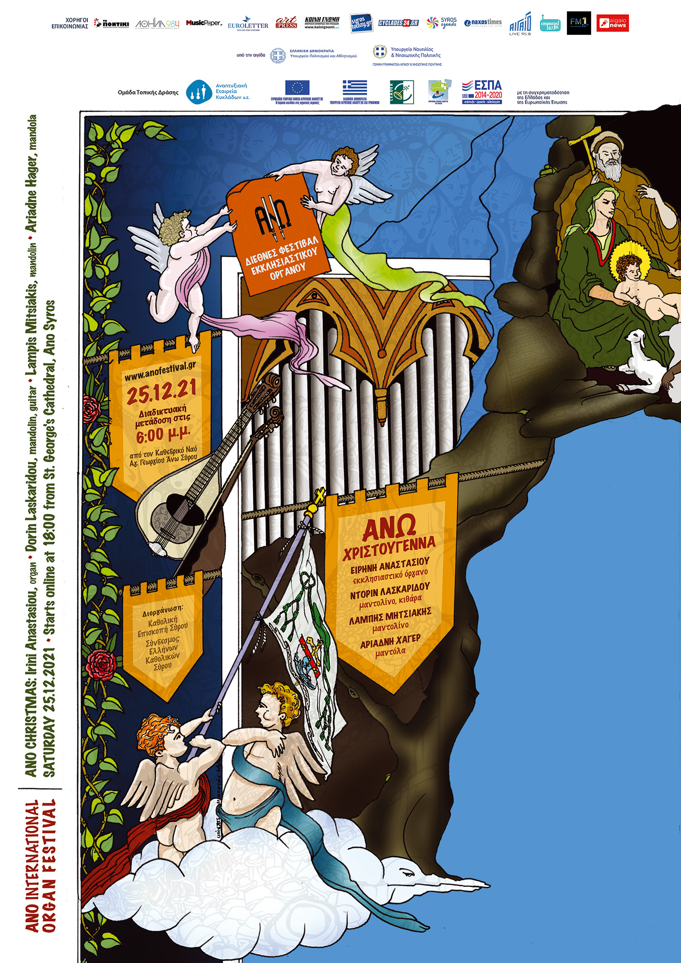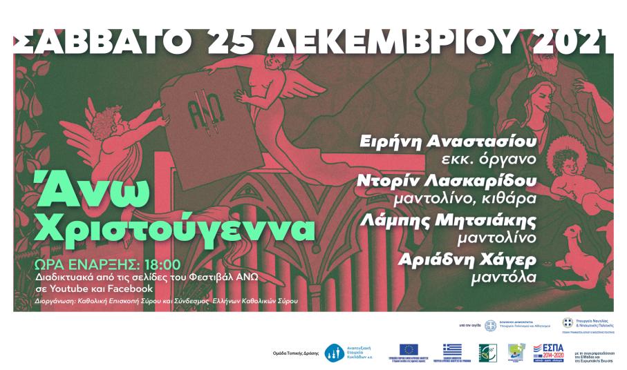 Αποχαιρετώντας τη χρονιά που φεύγει, το Διεθνές Φεστιβάλ Εκκλησιαστικού Οργάνου «ΑΝΩ» παρουσιάζει την καθιερωμένη Χριστουγεννιάτικη συναυλία του στον Καθεδρικό Ναό Αγίου Γεωργίου Άνω Σύρου, χωρίς την παρουσία κοινού, που θα μεταδοθεί διαδικτυακά, από τις σελίδες του Φεστιβάλ ΑΝΩ σε YouTube και Facebook, το Σάββατο, 25 Δεκεμβρίου 2021, στις 6 μ.μ.