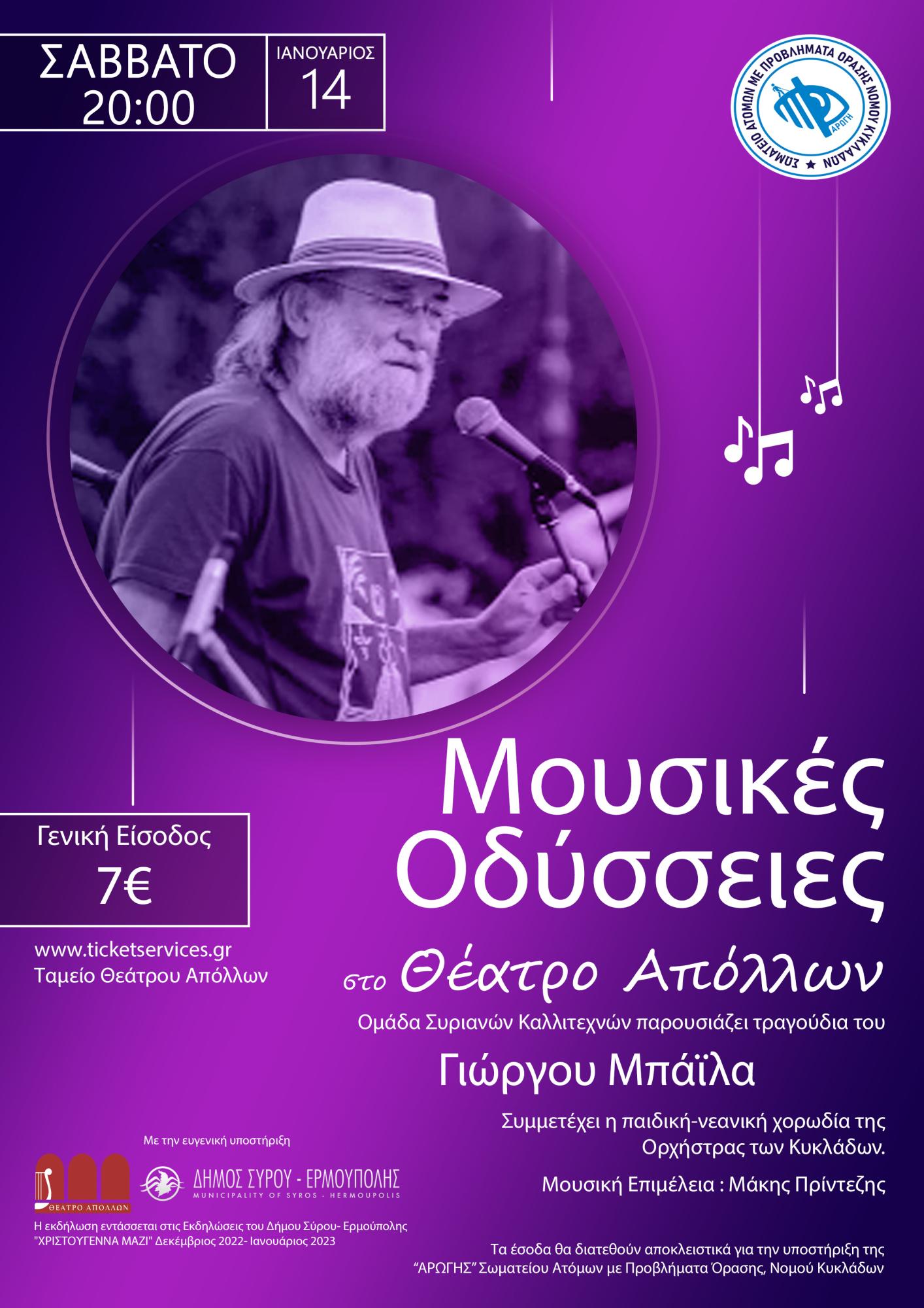 Συναυλία με τίτλο "ΜΟΥΣΙΚΕΣ ΟΔΥΣΣΕΙΕΣ" θα πραγματοποιηθεί το Σάββατο 14 Ιανουαρίου 2023 στις 20:00 στο Θέατρο Απόλλων με σκοπό τη στήριξη της "ΑΡΩΓΗΣ" του Σωματείου Ατόμων με Προβλήματα Όρασης Νομού Κυκλάδων.