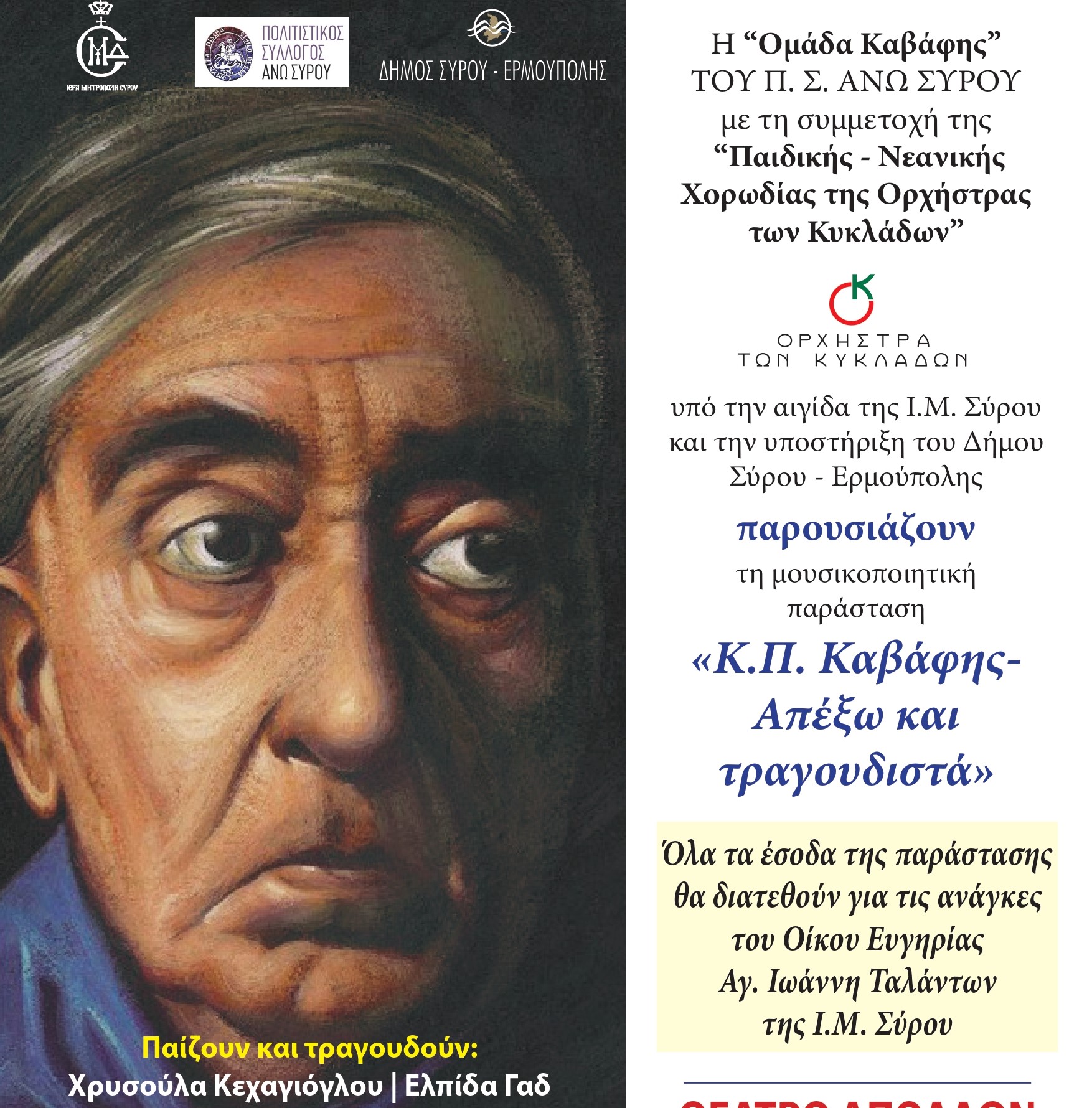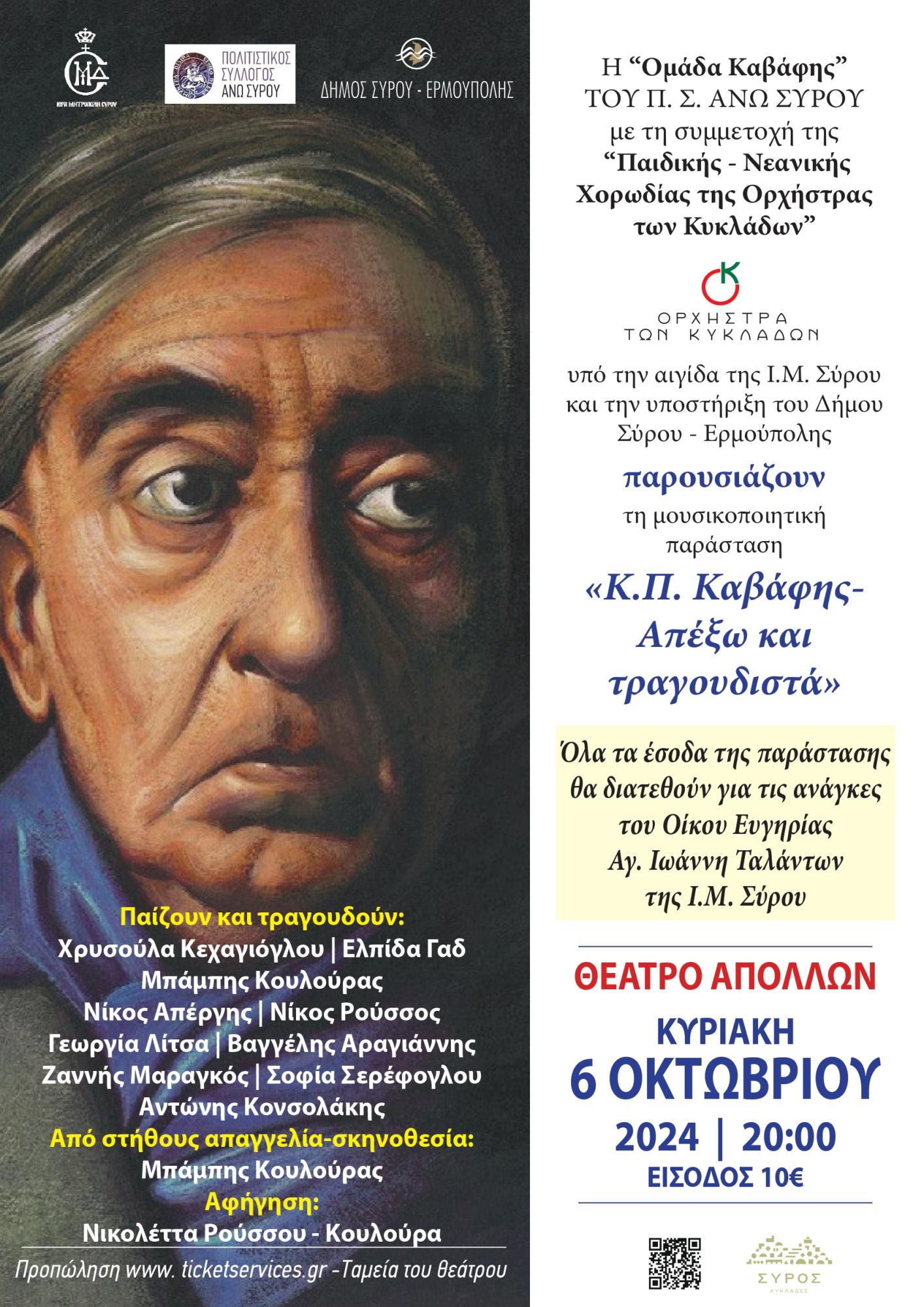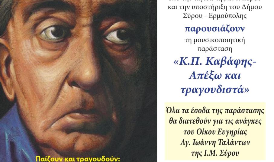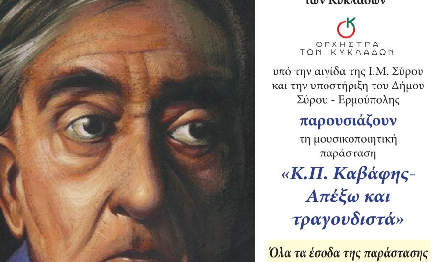 Η Ομάδα Καβάφης του Πολιτιστικού Συλλόγου Άνω Σύρου, πραγματοποιεί στο θέατρο Απόλλων Σύρου την Κυριακή 6 Οκτωβρίου στις 8 το βράδυ, την κοσμογυρισμένη της μουσικοποιητική της παράσταση '"Κ.Π. Καβάφης - Απέξω και τραγουδιστά'.