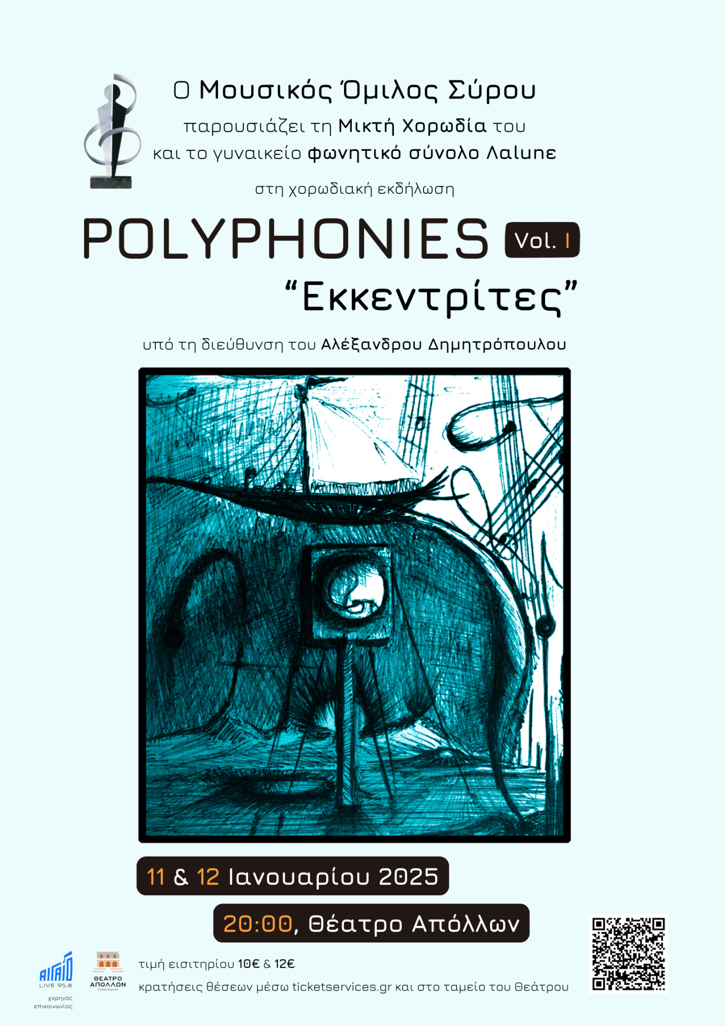 Τα χορωδιακά σύνολα του Μουσικού Ομίλου Σύρου (Μικτή Χορωδία Μουσικού Ομίλου Σύρου & Γυναικείο Φωνητικό Σύνολο "Λαlunε") σας προσκαλούν στις 11 & 12 Ιανουαρίου 2025 στο Θέατρο Απόλλων σε μια παράσταση ιδιαίτερων χορωδιακών διασκευών με συνοδεία μικρής ορχήστρας αποτελούμενης από πιάνο, κιθάρα, ακορντεόν, βιόλα, τσέλο, κοντραμπάσο. Έργα της pop, rock, punk αλλά και της ελληνικής έντεχνης - παραδοσιακής μουσικής μετατρέπονται σε πολυφωνική (αντιστικτική) μουσική διαφορετικών ηχοχρωμάτων και ηχητικών συνδυασμών.