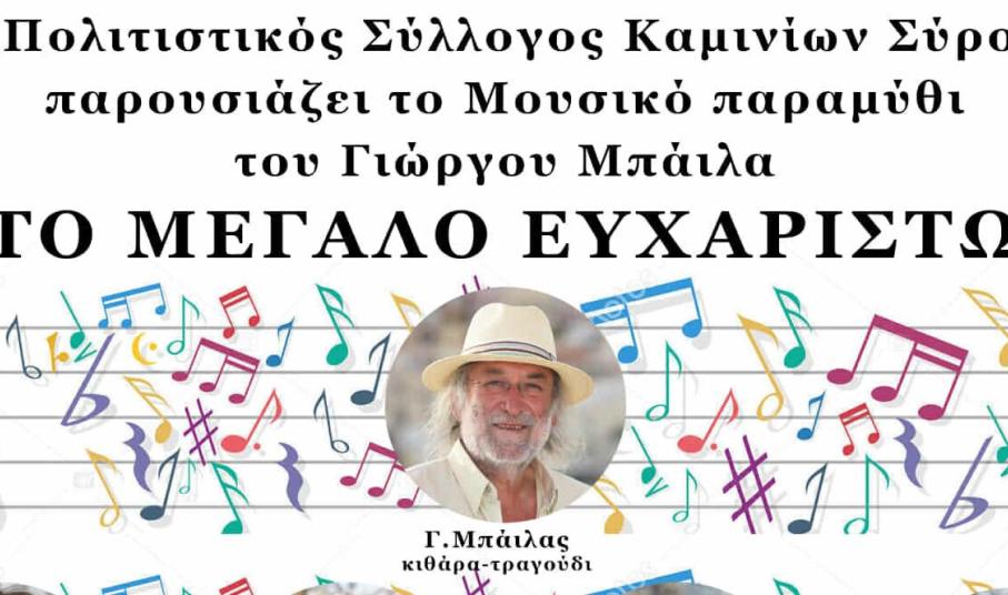 Το Σάββατο 19 Ιουλίου στις 8 και μισή το βράδυ, στον προαύλιο χώρο του Πολιτιστικού Συλλόγου Καμινίων, μικροί και μεγάλοι θα έχουν την ευκαιρία να απολαύσουν για ακόμη μία φορά, το ξεχωριστό μουσικό παραμύθι με τίτλο "Το Μεγάλο Ευχαριστώ", του Γιώργου Μπάιλα.