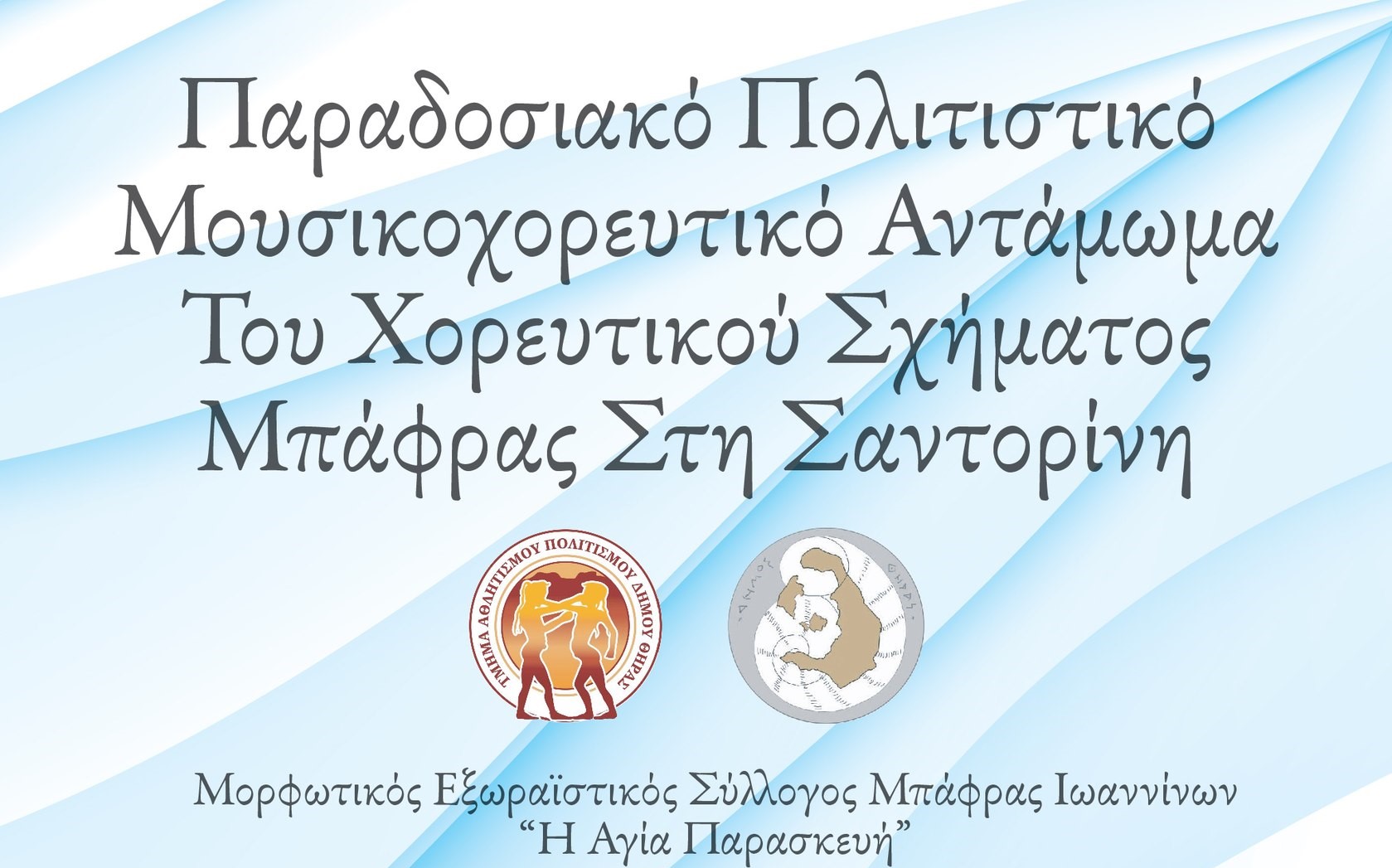 Τα χορευτικά σχήματα του Δήμου Θήρας και το χορευτικό σχήμα «Σαντορίνη» (Διεθνές), υπό τη διδασκαλία και επιμέλεια της κ. Σταματίνας Ξιάρχου, θα ανταμώσουν χορευτικά με το σχήμα του Μορφωτικού Εξωραϊστικού Συλλόγου Μπάφρας Ιωαννίνων «Η Αγία Παρασκευή».