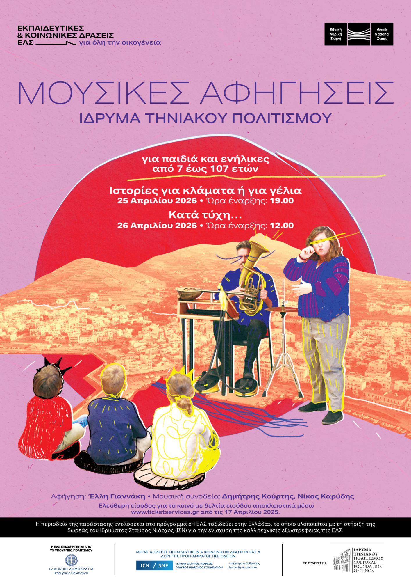 Οι Εκπαιδευτικές & Κοινωνικές Δράσεις της Εθνικής Λυρικής Σκηνής συνεχίζουν τις περιοδείες τους στην Ελλάδα με μια σειρά παραστάσεων και εκπαιδευτικών δράσεων στην Τήνο, σε συνεργασία με το Ίδρυμα Τηνιακού Πολιτισμού. Οι δράσεις απευθύνονται τόσο στο ευρύ κοινό όσο και στα σχολεία Πρωτοβάθμιας εκπαίδευσης του νησιού συνδέοντας τη μουσική, την αφήγηση και το θέατρο με τη βιωματική εμπειρία και τη δημιουργική συμμετοχή.