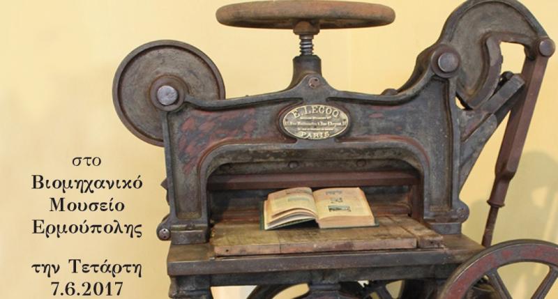 Ο Σύλλογος Φίλων Τεχνικού Πολιτισμού Ερμούπολης και ο Δήμος Σύρου - Ερμύπολης σας προσκαλούν στα εγκαίνια της έκθεσης "Ανιχνεύοντας τους τυπογράφους και τα τυπογραφεία της Σύρου τον 19ο και 20ο αιώνα" στο Βιομηχανικό Μουσείο Ερμούπολης, την Τετάρτη 7 Ιουνίου και ώρα 20.00.