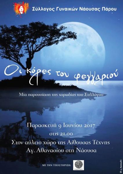 Η χορωδία του Συλλόγου Γυναικών Νάουσας Πάρου παρουσιάζει ένα αφιέρωμα στο ελληνικό τραγούδι με το γενικό τίτλο: "Όι κόρες του φεγγαριού" την Παρασκευή 9 Ιουνίου 2017 στις 21:00 στον αύλειο χώρο της Αίθουσας Τέχνης Αγ. Αθανασίου Νάουσας Πάρου.