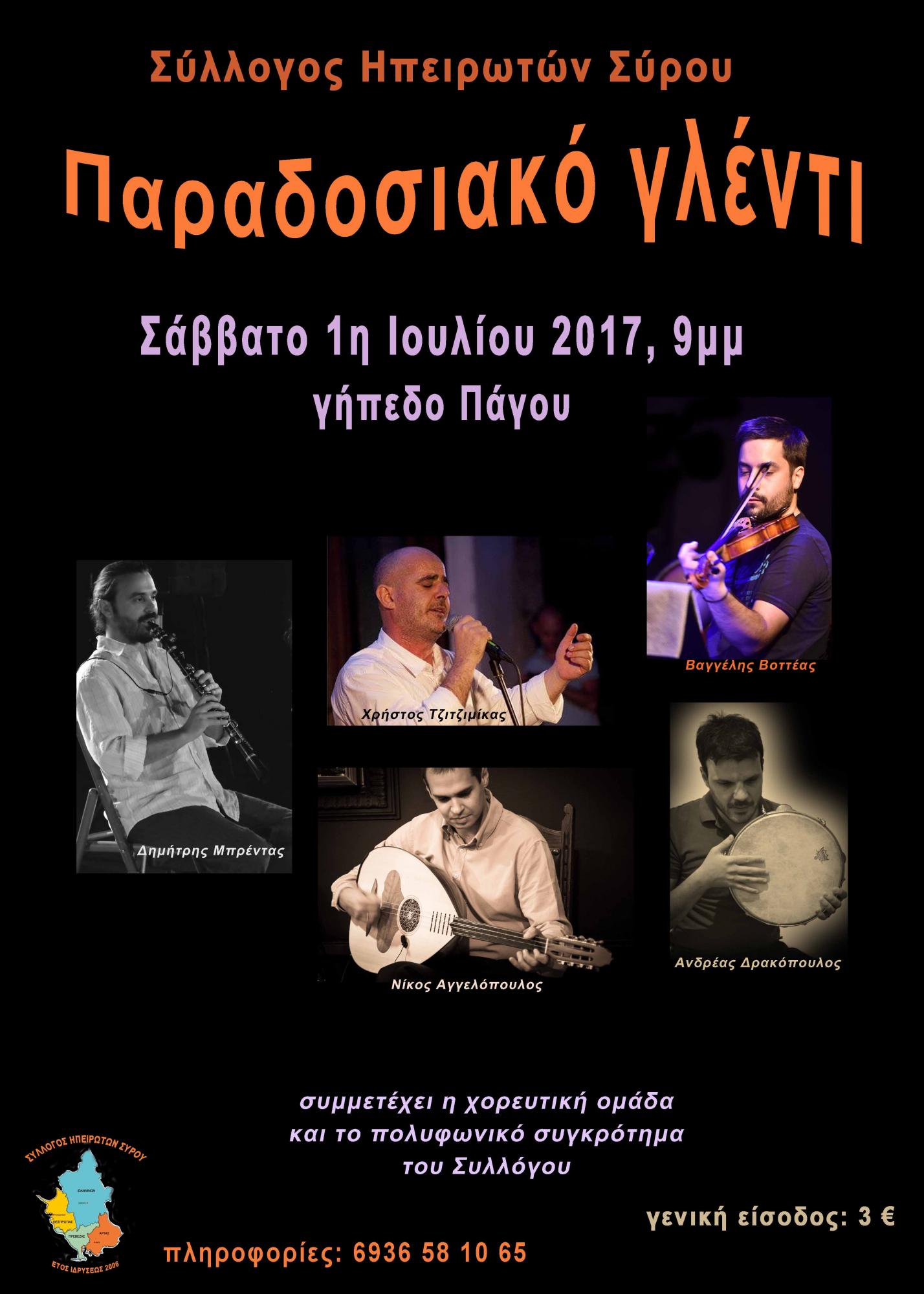 Ο Σύλλογος Ηπειρωτών Σύρου προσκαλεί όλους στο παραδοσιακό γλέντι που οργανώνει, για όγδοη συνεχή χρονιά, το Σάββατο 1η Ιουλίου, στο γήπεδο του Πάγου.