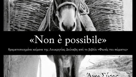Η θεατρική ομάδα Μίμου Άπτου παρουσιάζει την Κυριακή 18 Ιουνίου στην Άνω Σύρο, την παράσταση με τίτλο Non è possibile. Πρόκειται για 4 διηγήματα της συριανής συγγραφέως Λουκρητίας Δούναβη από το βιβλίο «Φωνές του Σώματος» που δραματοποιούνται για πρώτη φορά στο φυσικό τους χώρο. Τα 4 διηγήματα θα παρουσιαστούν σε 4 σημεία της Άνω Σύρου. Η συνάντηση είναι στις 19.30 στην Καμάρα.