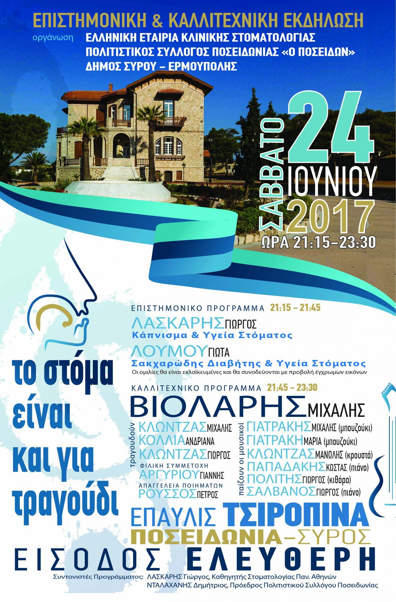 H Ελληνική Εταιρία Κλινικής Στοματολογίας, στο πλαίσιο των εκλαϊκευμένων ενημερωτικών δραστηριοτήτων της για τις αρρώστιες του στόματος, διοργανώνει για δεύτερη χρονιά, με συνδιοργανωτή τον Πολιτιστικό Σύλλογο Ποσειδωνίας “Ο Ποσειδών” και την υποστήριξη του Δήμου Σύρου-Ερμούπολης, την επιστημονική και καλλιτεχνική εκδήλωση “Το στόμα είναι και για τραγούδι”, το Σάββατο 24 Ιουνίου 2017 και ώρα 21:15΄ στην Έπαυλη Τσιροπινά στην Ποσειδωνία, με είσοδο ελεύθερη.