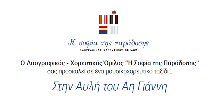 Ο Λαογραφικός - Χορευτικός Όμιλος “Η Σοφία της Παράδοσης” σας προσκαλεί σε ένα μουσικοχορευτικό ταξίδι... που θα πραγματοποιηθεί τη Δευτέρα 26 Ιουνίου 2017 και ώρα 19:00 στον προαύλιο χώρο