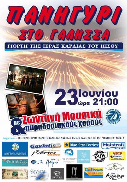 Στο πλαίσιο του πολιτιστικού προγράμματος του Δήμου Σύρου – Ερμούπολης «Σύρος –Πολιτισμός 2017», ο Εξωραϊστικός Πολιτιστικός Σύλλογος Γαλησσά, ο Ναυτικός Όμιλος Γαλησσά και η Τοπική Κοινότητα Γαλησσά σας προσκαλούν στο Πανηγύρι για την Εορτή της Ιεράς Καρδίας του Ιησού, την Παρασκευή 23 Ιουνίου 2017 και ώρα 21:00, με ζωντανή μουσική και παραδοσιακούς χορούς.