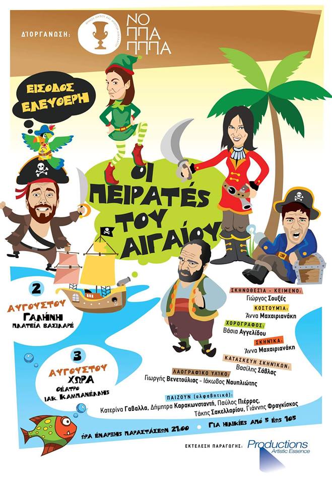Την Τετάρτη, 2 Αυγούστου, 21:00 στη "Γαλήνη" και την Πέμπτη, 3 Αυγούστου, 21:00 στο Δημοτικό Θέατρο «Ιάκωβος Καμπανέλλης» θα πραγματοποιηθεί η Θεατρική Παράσταση «Οι Πειρατές του Αιγαίου».