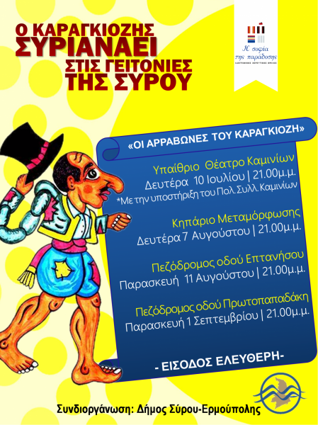 Στο πλαίσιο του πολιτιστικού προγράμματος του Δήμου Σύρου – Ερμούπολης «Σύρος –Πολιτισμός 2017» και των εκδηλώσεων «Ο Καραγκιόζης Συριανάει στις γειτονιές της Σύρου» , ο Λαογραφικός - Χορευτικός Όμιλος «Η Σοφία της Παράδοσης» παρουσιάζει την παράσταση θεάτρου σκιών «Οι αρραβώνες του Καραγκιόζη», στα ακόλουθα σημεία: