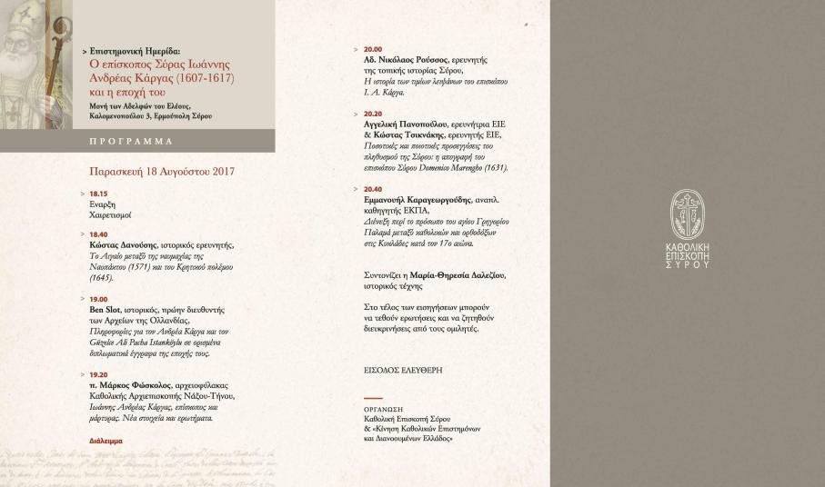 Στο πλαίσιο των επετειακών εκδηλώσεων για τα 400 χρόνια από το μαρτυρικό θάνατο του επισκόπου Σύρας Ιωάννη Ανδρέα Κάργα, διοργανώνεται Επιστημονική Ημερίδα με θέμα: "Ο επίσκοπος Σύρας Ιωάννης Ανδρέας Κάργας (1607-1617) και η εποχή του. Η Ημερίδα θα πραγματοποιηθεί στη Μονή των Αδελφών του Ελέους στις 18:15.