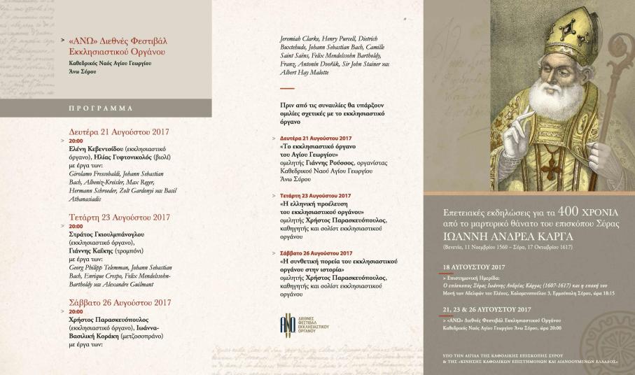 Επιπλέον, στις 21, 23 & 26 Αυγούστου θα διεξαχθεί το Διεθνές Φεστιβάλ Εκκλησιαστικού Ορργάνου "ΑΝΩ" στον Καθεδρικό Ναό Αγίου Γεωργίου Άνω Σύρου στις 20:30.