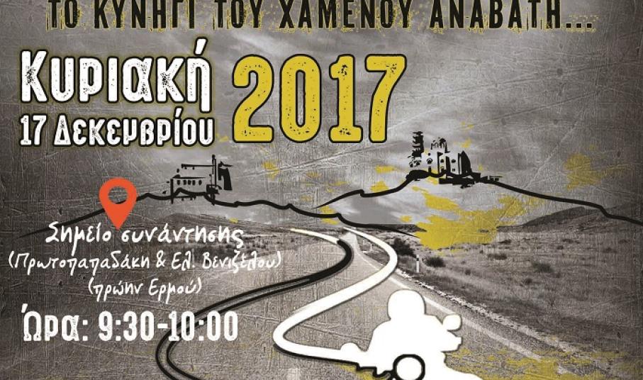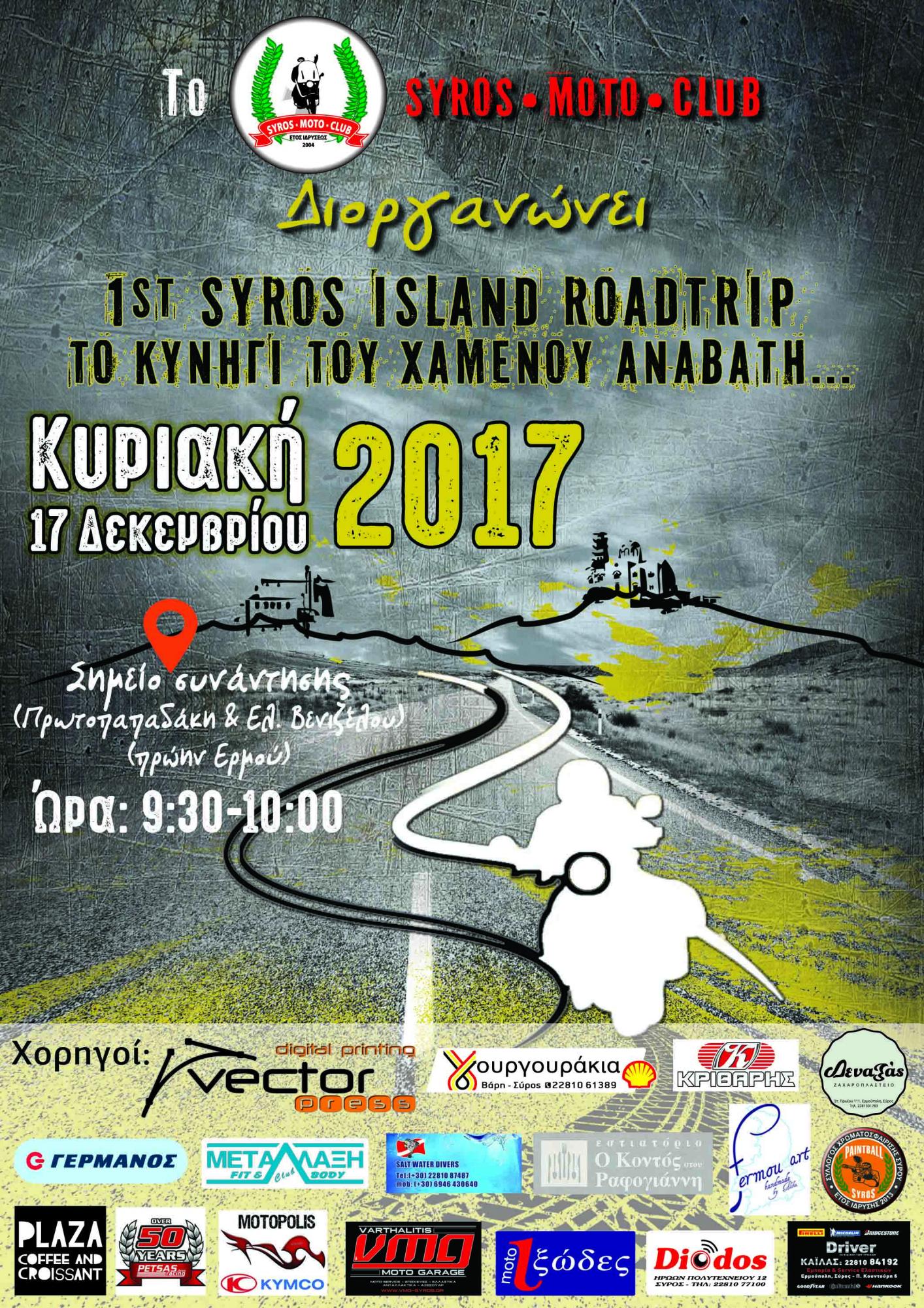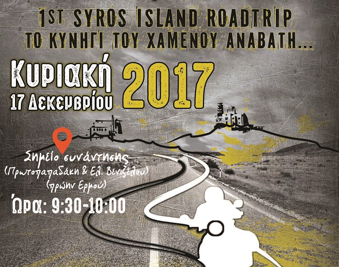 Ο Μοτοσυκλετιστικός Σύλλογος Σύρου – Syros Moto Club, θέλοντας να αναδείξει την ιστορία και τον πολιτισμό της Σύρου μέσα από το οδικό δίκτυό της, διοργανώνει την Κυριακή 17 Δεκεμβρίου 2017 την εκδήλωση: ΄΄1st Syros Island Road trip΄΄ - «Το κυνήγι του χαμένου αναβάτη» , και σας προσκαλεί να έλθετε με την μοτοσυκλέτα σας, ανεξαρτήτως τύπου (παπιά, σκούτερ, on/off, street, chopper κλπ.) και κυβισμού και να δηλώσετε συμμετοχή .