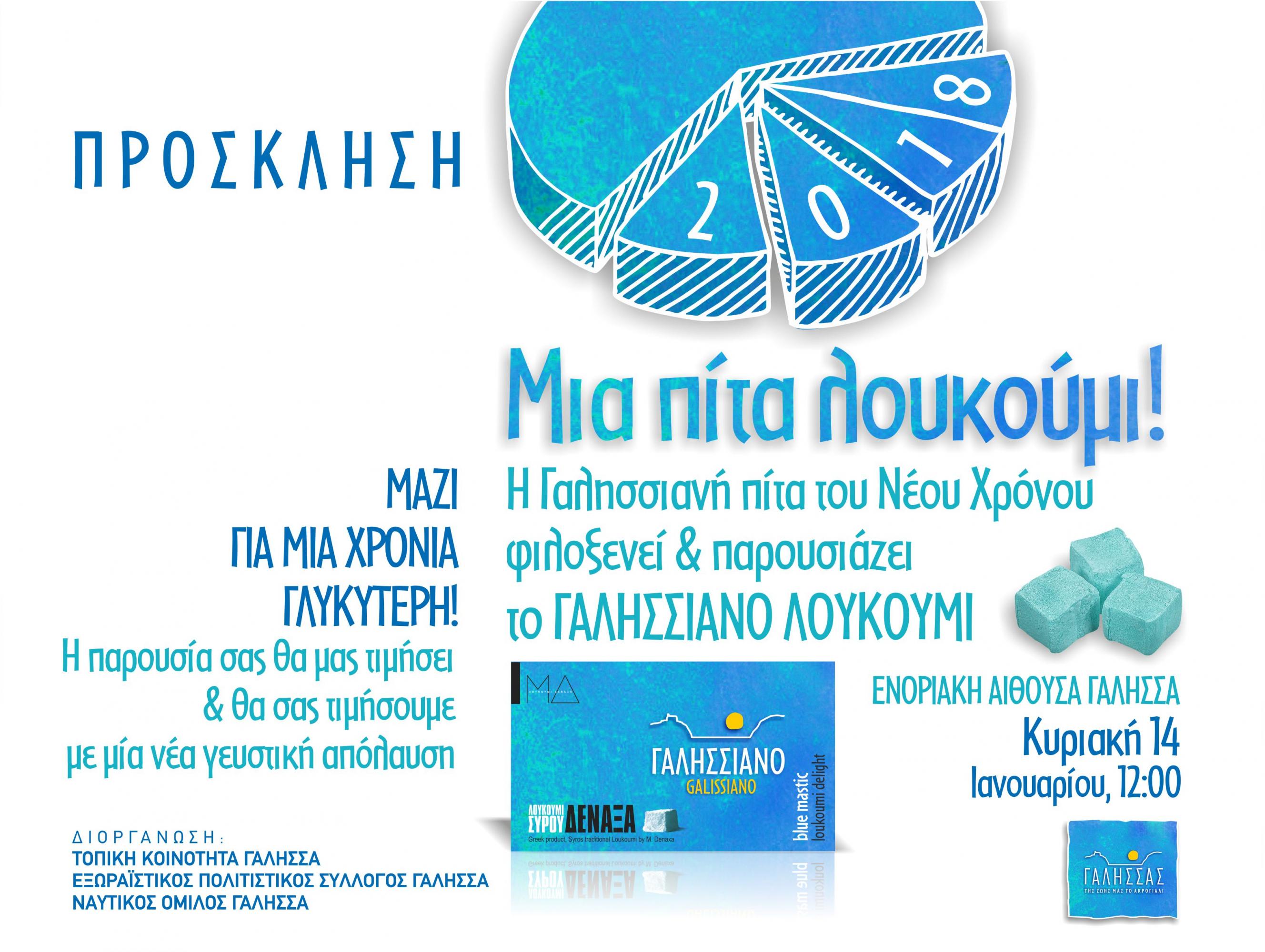 Η Τοπική Κοινότητα Γαλησσά, ο Εξωραϊστικός Πολιτιστικός Σύλλογος Γαλησσά και ο Ναυτικός Όμιλος Γαλησσά σας προσκαλούν στην εκδήλωση για την κοπή της πρωτοχρονιάτικης πίτας που θα πραγματοποιηθεί την Κυριακή 14 Ιανουαρίου στις 12 μ.μ στην ενοριακή αίθουσα Γαλησσά.