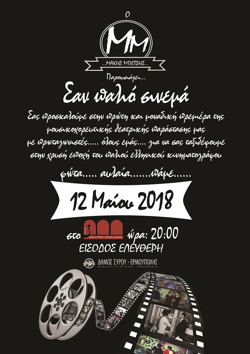 Η Σχολή Χορού Μάκη Μπέτση παρουσιάζει στο Θέατρο Απόλλων, το Σάββατο 12 Μαΐου 2018 και ώρα 20:00, μια μοναδική μουσικοχορευτική θεατρική παράσταση που θα μας ταξιδέψει στη χρυσή εποχή του παλιού ελληνικού κινηματογράφου.