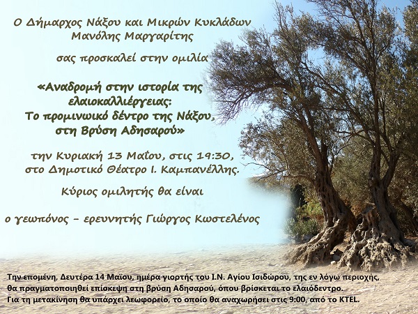 Ο Δήμαρχος Νάξου και Μικρών Κυκλάδων Μανόλης Μαργαρίτης σας προσκαλεί στην ομιλία «Αναδρομή στην ιστορία της ελαιοκαλλιέργειας: Το προμινωικό δέντρο της Νάξου, στη Βρύση Αδησαρού» την Κυριακή 13 Μαΐου, στις 19:30, στο Δημοτικό Θέατρο Ιάκωβος Καμπανέλλης.