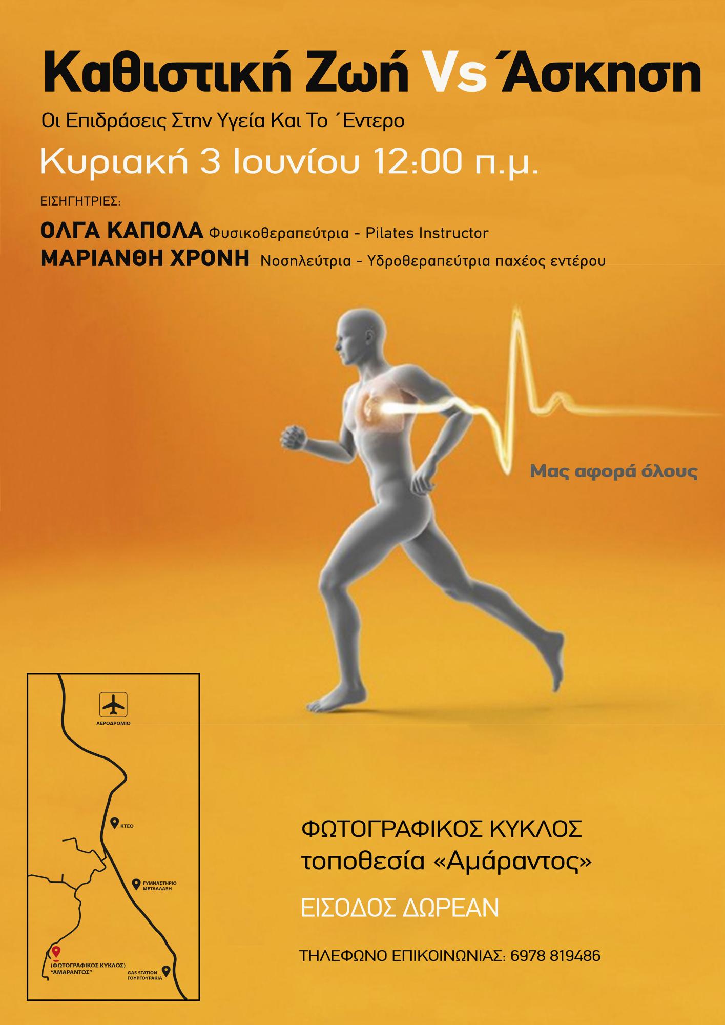 Μια ομιλία με στόχο να αφυπνίσει και να ενημερώσει άπαντες τους παρευρισκόμενους σχετικά με τις δυσμενείς επιπτώσεις της καθιστικής ζωής τόσο στην γενικότερη υγεία του ανθρώπου όσο και στο μυοσκελετικό του σύστημα. Πώς αυτή η σύγχρονη μάστιγα επηρεάζει την υγεία του εντέρου, ο ρόλος του οποίου είναι καταλυτικός για την υγεία του ανθρώπου; Πώς η άσκηση παρουσιάζεται σαν από μηχανής θεός για τη λύση αυτού του προβλήματος της σύγχρονης εποχής και πόσο σημαντική είναι η παρουσία της στην καθημερινότητα μας; Ποια είναι η σωστή στάση σώματος και πως μπορούμε να την διατηρήσουμε; Σας προσκαλούμε στην ομιλία μας που θα δώσει απαντήσεις σε όλα αυτά τα ερωτήματα.