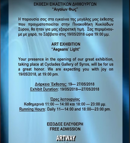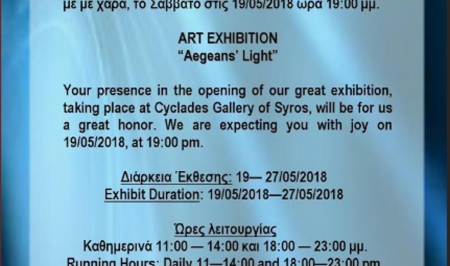 Ομαδική έκθεση εικαστικών στην Πινακοθήκη Κυκλάδων με τίτλο "ΑΑΙΓΑΙΟΝ ΦΩΣ" από τις 19 έως τις 27 Μαΐου.