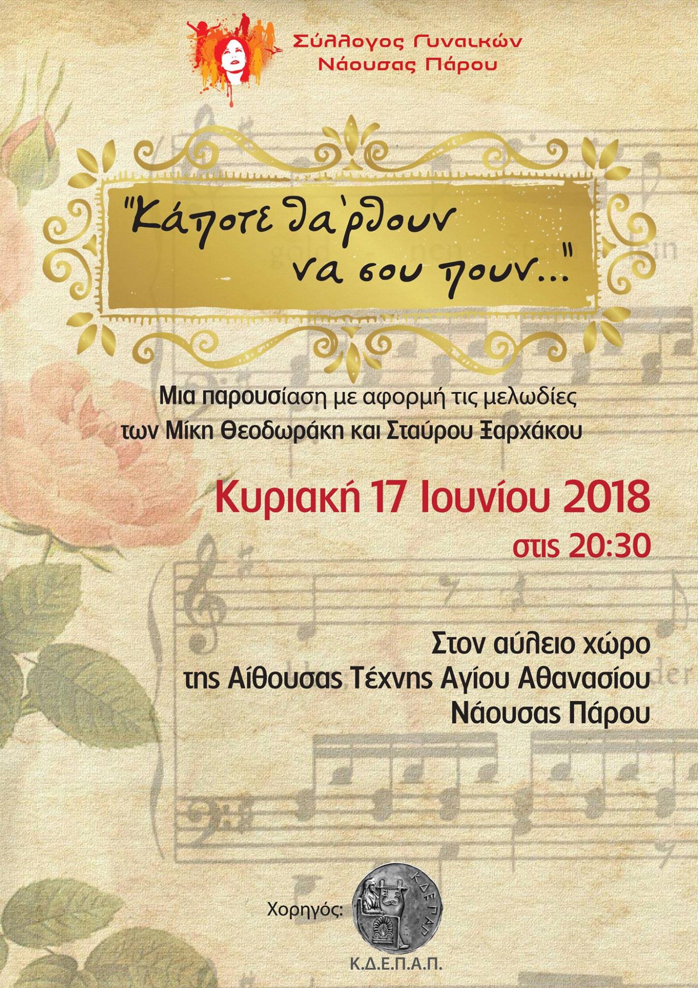 Η χορωδία του Συλλόγου Γυναικών Νάουσας Πάρου θα κάνει μία παρουσίαση με αφορμή τις μελωδίες των Μίκη Θεοδωράκη και Σταύρου Ξαρχάκου με το γενικό τίτλο: