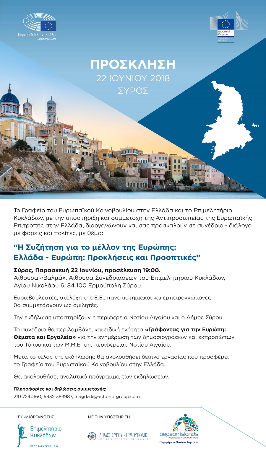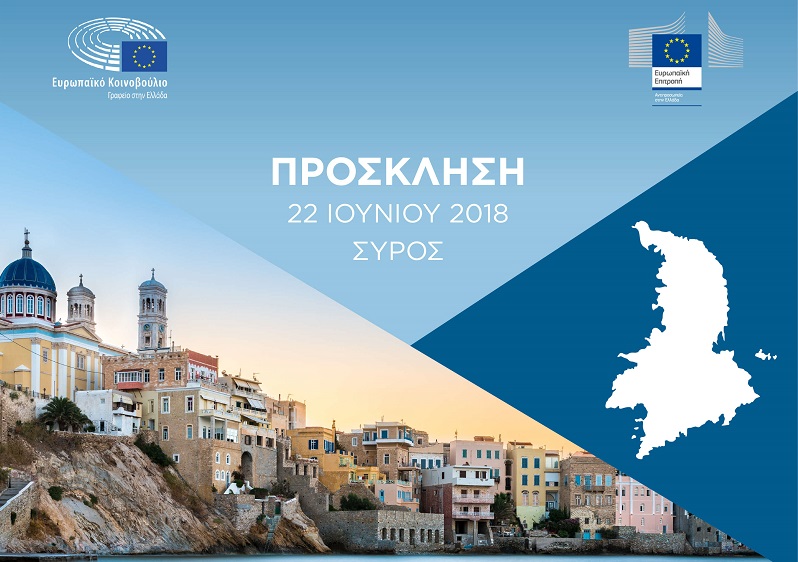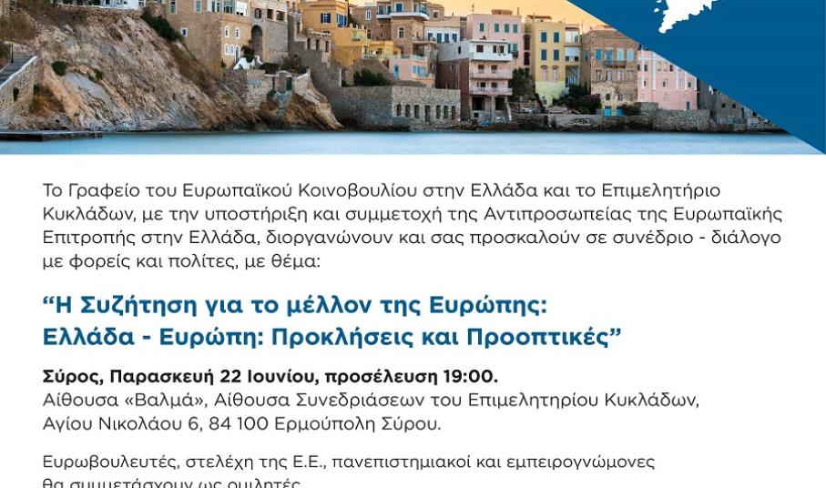 Εκ μέρους του Λεωνίδα Αντωνακόπουλου, Επικεφαλής του Γραφείου του Ευρωπαϊκού Κοινοβουλίου στην Ελλάδα γνωστοποιείται πρόσκληση, για το Συνέδριο – Διάλογο με φορείς και πολίτες με θέμα «Η Συζήτηση για το μέλλον της Ευρώπης: Ελλάδα - Ευρώπη: Προκλήσεις και Προοπτικές», που θα πραγματοποιηθεί στη Σύρο, στις 22/06/2018.