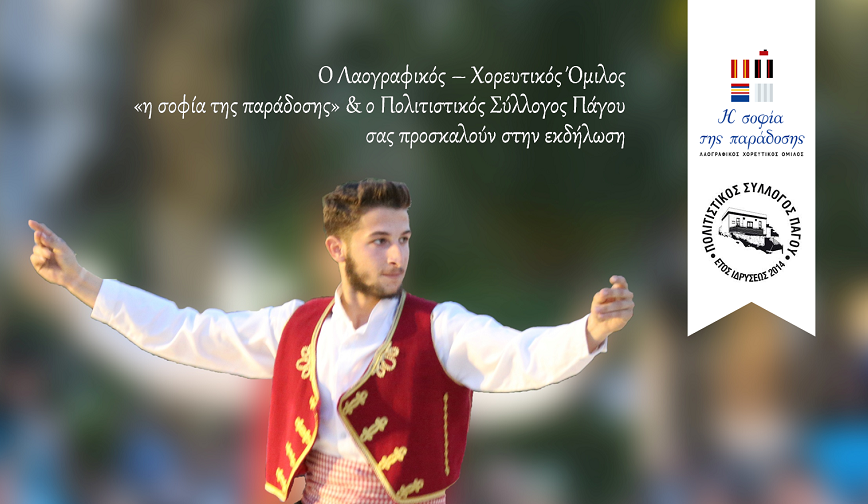 Ο Λαογραφικός χορευτικός Όμιλος "η σοφία της παράδοσης" σε συνεργασία με τον Πολιτιστικό σύλλογο Πάγου παρουσιάζουν την μουσικοχορευτική παράσταση με τίτλο "Οταν αρχίζει ο χορός, μιλάει η καρδιά στην σκέψη" στο Γήπεδο μπασκετ του Πάγου το Σάββατο 16 Ιουνίου στις 19.30. Θα ακολουθήσει παραδοσιακό γλέντι με ζωντανή ορχήστρα!