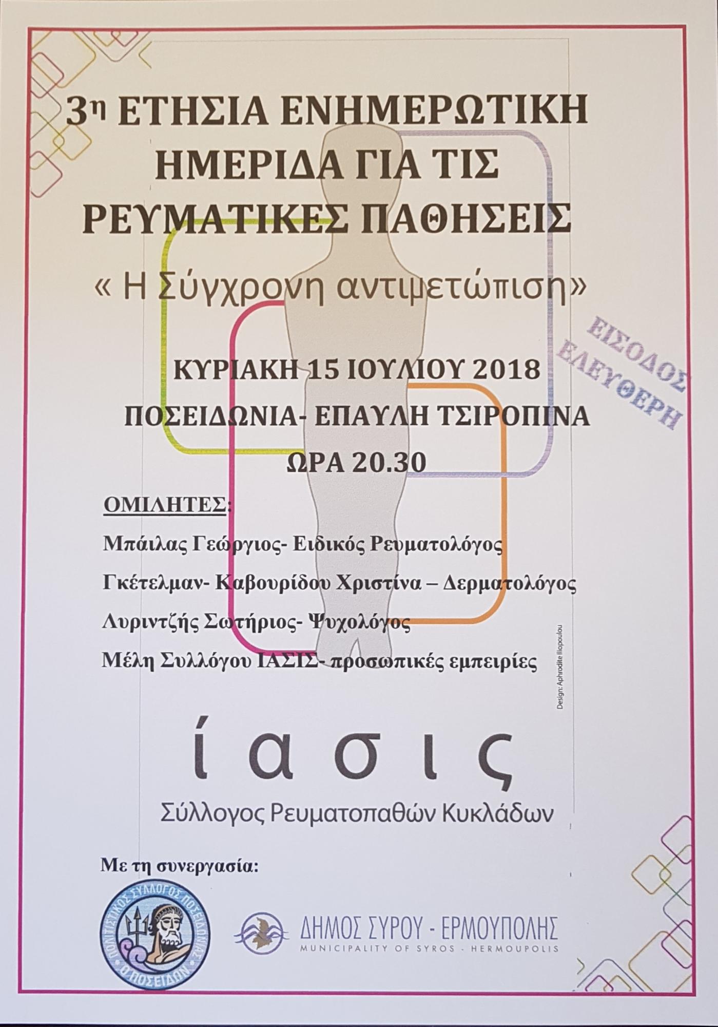 Ο Σύλλογος Ρευματοπαθών και Φίλων Κυκλάδων με χαρά σας προσκαλεί στην 3η ετήσια ενημερωτική ημερίδα που θα πραγματοποιηθεί την Κυριακή 15 Ιουλίου και ώρα 20.30 στην έπαυλη Τσιροπινά στην Ποσειδωνία. Οι ομιλητές ιατρος- ρευματολόγος κ.Γ Μπάιλας, ιατρός- δερματολόγος κ. Χ. Γκέτελμαν-Καβουρίδου και ο ψυχολόγος κ. Σ.Λυριντζής, θα αναφερθούν στα ρευματικά νοσήματα και ιδιαίτερα στις σπονδυλαρθρίτιδες και τη ψωριασική νόσο. Μέλη του συλλόγου μας θα μοιραστούν με το κοινό προσωπικές εμπείριες και στο τέλος θα δεχθούν όλοι ερωτήσεις, ώστε να πραγατοποιηθεί μια ευχάριστη συζήτηση.