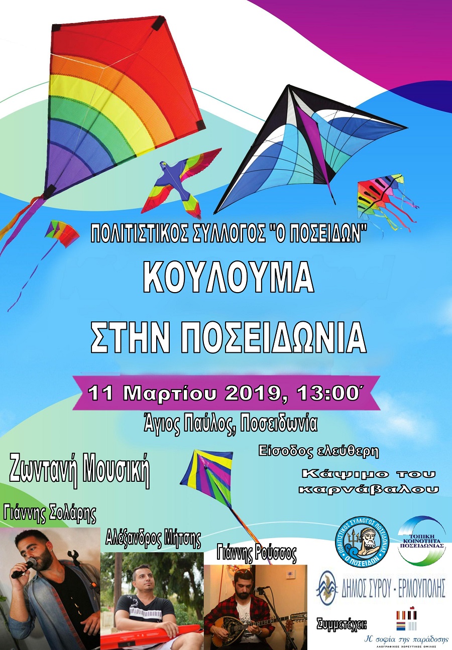 Ο Πολιτιστικός Σύλλογος Ποσειδωνίας, ο Δήμος Σύρου-Ερμούπολης και η Τοπική Κοινότητα Ποσειδωνίας, στο πλαίσιο των εκδηλώσεων του Συριανού καρναβαλιού "Γεώργιος Σουρής", σας προσκαλούν στην εκδήλωση "Κούλουμα στην Ποσειδωνία", που θα πραγματοποιηθεί την Καθαρά Δευτέρα 11/3/2019 και ώρα 13:00' στο Ποιμαντικό Κέντρο του Αγίου Παύλου.