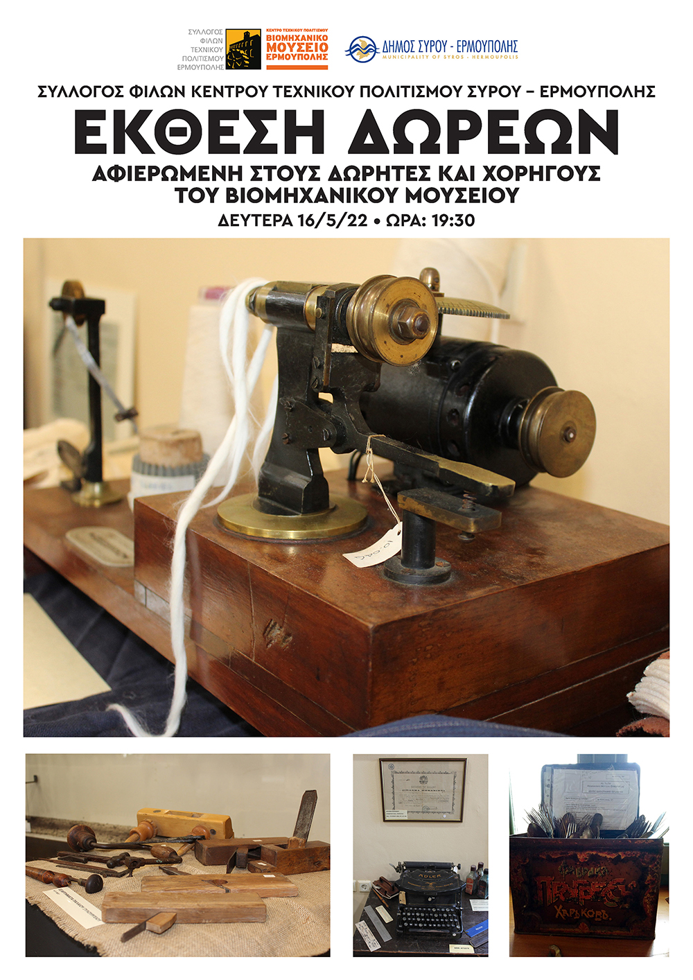 Εγκαίνια της «Εκθεσης Δωρεών» που είναι αφιερωμένη στους Δωρητές και στους Χορηγούς του Βιομηχανικού Μουσείου Ερμούπολης την Δευτέρα 16 Μαΐου 2022 και ώρα 19:30.