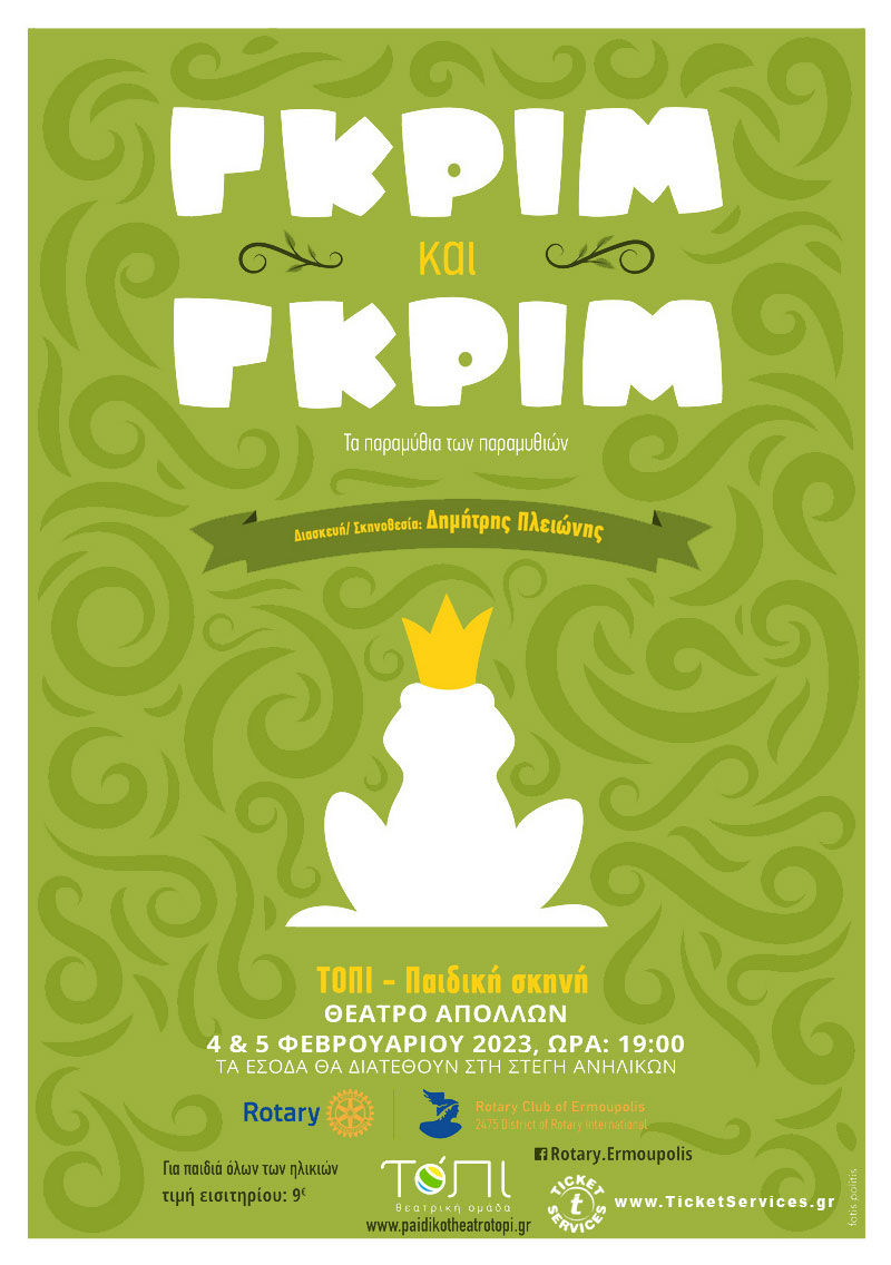 Ο Ροταριανό Όμιλος Ερμουπόλεως διοργανώνει την θεατρική παράσταση «Γκριμ και Γκριμ» Tα παραμύθια των παραμυθιών!! για παιδιά όλων ηλικιών με την συνεργασία της θεατρικής ομάδας "ΤΟΠΙ".