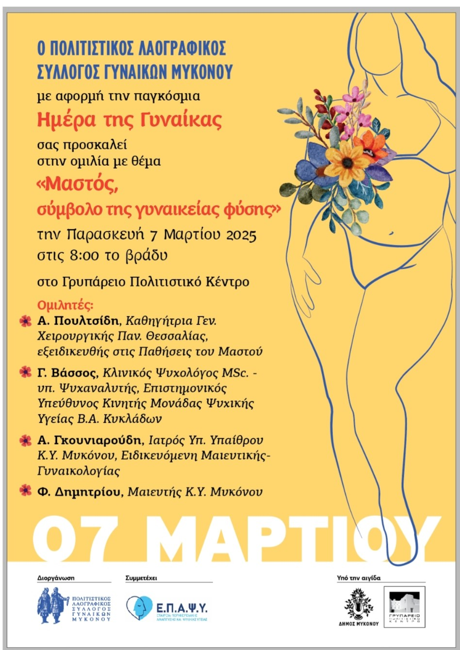 Ο Πολιτιστικός Σύλλογος Γυναικών Μυκόνου διοργανώνει εκδήλωση με τίτλο «Μαστός, Σύμβολο της Γυναικείας Φύσης» με αφορμή την Παγκόσμια Ημέρα της Γυναίκας. Στην εκδήλωση θα συμμετάσχει η Εταιρεία Περιφερειακής Ανάπτυξης και Ψυχικής Υγείας (ΕΠΑΨΥ), με ομιλητή τον κύριο Βάσσο, Επιστημονικά Υπεύθυνο της Κινητής Μονάδας Βορειοανατολικών Κυκλάδων.