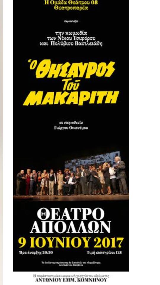Στο πλαίσιο του προγράμματος «Σύρος – Πολιτισμός 2017», κοινωνία και πολιτισμός «παντρεύονται» αρμονικά μέσα από την παράσταση «Ο θησαυρός του μακαρίτη» της «Ομάδας Θεάτρου 08», γνωστής στο κοινό της ως «Θεατροπαρέα».