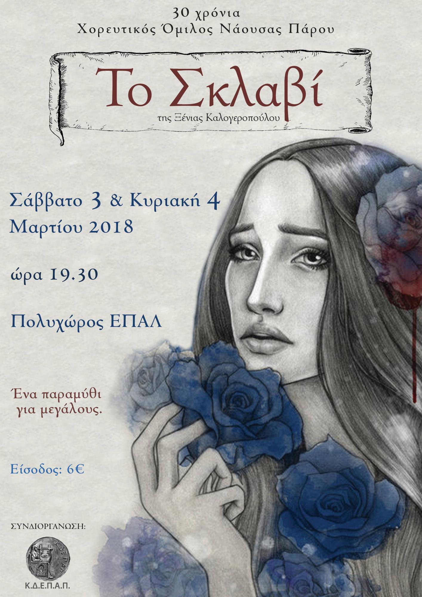 «Το σκλαβί», την κλασική πλέον διασκευή του γνωστού συμιακού παραμυθιού από την Ξένια Καλογεροπούλου, θα παρουσιάσει το θεατρικό τμήμα του Χορευτικού Ομίλου Νάουσας Πάρου το Σάββατο 3 και την Κυριακή 4 Μαρτίου 2018, στις 19.30, στην αίθουσα του Πολυχώρου του ΕΠΑΛ στην Παροικιά, σε σκηνοθεσία Γιώργου Γεμελιάρη. Ο ΧΟΝ επιχειρεί για πρώτη φορά να ενώσει την «Θεατρική Παιδική Συντροφιά» με τη «Θεατρική Ομάδα» των ενηλίκων. Έτσι, ένας θίασος με 30 ερασιτέχνες ηθοποιούς επί σκηνής δημιουργεί μια μαγευτική ατμόσφαιρα που μας ταξιδεύει σε χώρες μακρινές. Ένα βασιλόπουλο ερωτεύεται τη ζωγραφιά της «Όμορφης του Κόσμου». Ξεκινά να πάει να τη βρει μαζί με τον αδελφό του, το Σκλαβί, νόθο γιο του βασιλιά και μιας σκλάβας. Η περιπέτεια θα είναι δύσκολη, γεμάτη εμπόδια και ανατροπές. Άραγε θα τα καταφέρουν και αν ναι, ποιο θα είναι το τίμημα;