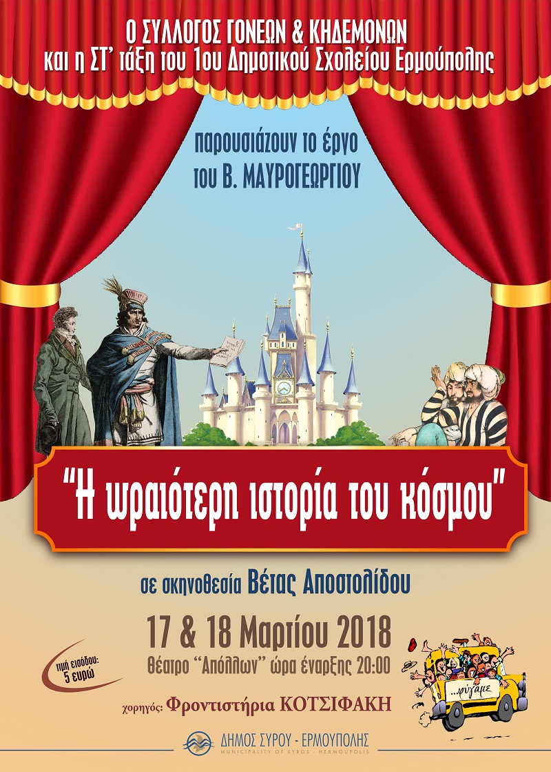 Ο Σύλλογος Γονέων και Κηδεμόνων και η ΣΤ’ τάξη του 1ου Δημοτικού Σχολείου Ερμούπολης, υπό την αιγίδα του Δήμου Σύρου – Ερμούπολης, παρουσιάζουν το θεατρικό έργο του Β. Μαυρογεωργίου «Η ωραιότερη ιστορία του κόσμου» σε σκηνοθεσία Βέτας Αποστολίδη, το Σάββατο 17 και την Κυριακή 18 Μαρτίου 2018 και ώρα 20:00, στο Θέατρο Απόλλων.
