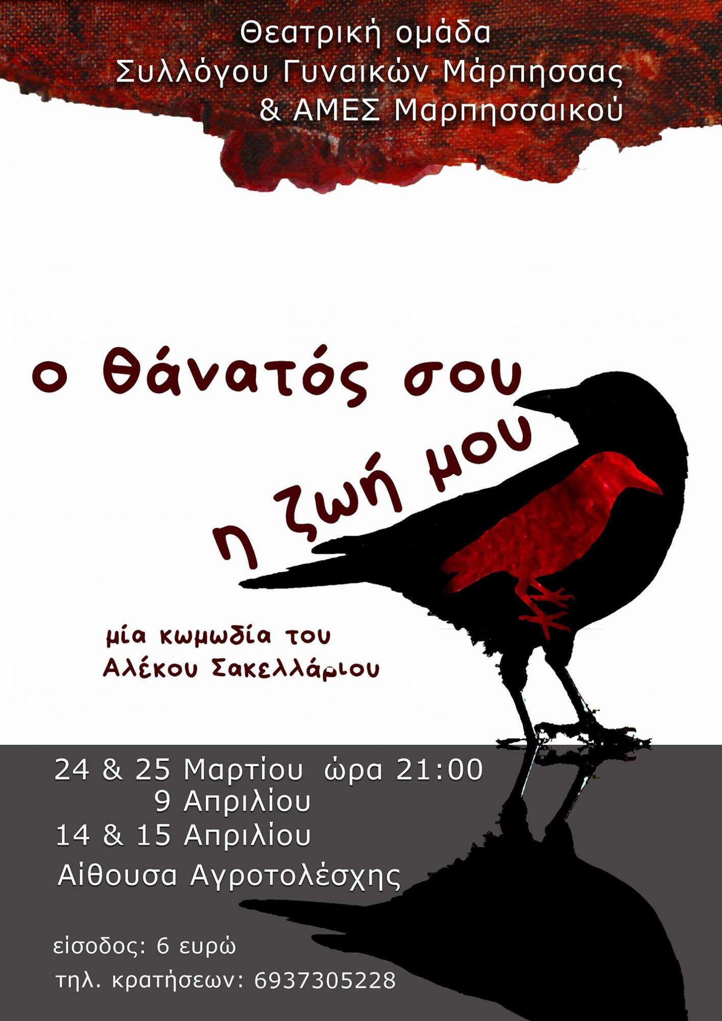 Η Θεατρική Ομάδα του Συλλόγου Γυναικών Μάρπησσας & ΑΜΕΣ Μαρπησσαϊκού προσκαλούν το κοινό της Πάρου στην παράσταση "Ο θάνατός σου, η ζωή μου", μια κωμωδία του Αλέκου Σακελλάριου.